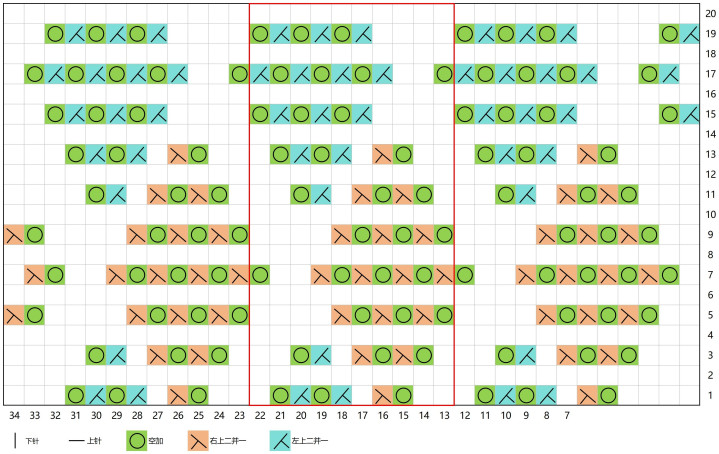 1.起针数是10的倍数,片织需要多加4针,共需要织20行,空白格子均为下针