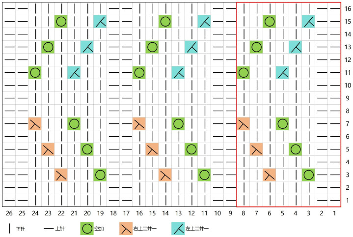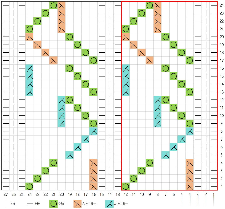 1.起针数是12的倍数,片织需要多加3针,共需要织24行,空格子均为下针