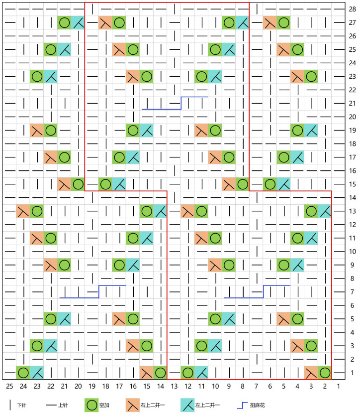 1.起针数是12的倍数,片织需要多加1针,共需要织28行