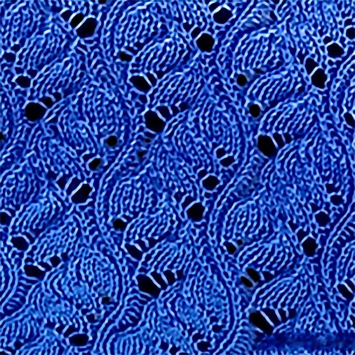 4.此组针法分为2层,下层是3组右上二并一和空加的叠排,上层则是左上二并一和空加,这样就形成了2针宽的波浪