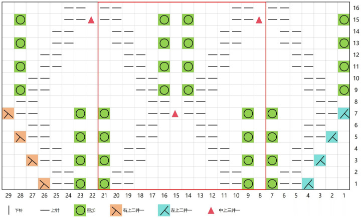 2.圈织循环织8-21,片织开头织1-7,中间循环织8-21,结尾织22-29